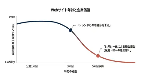 Webサイトの「賞味期限」は一般的に3〜5年と言われています。公開から3年を過ぎるとトレンドとの乖離が始まり、5年を超えると採用やIR活動にまで悪影響を及ぼす「レガシー化」のリスクが高まります。