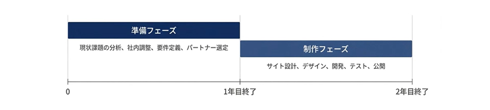多くの企業が、この「水面下」の準備期間の重要性を見落としています。これらを合わせると、リニューアルは合計で約2年に及ぶ長期プロジェクトなのです。