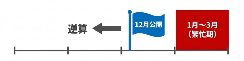 早め早めに着手し、繁忙期を避けて公開できるスケジュールを組むことが重要です。